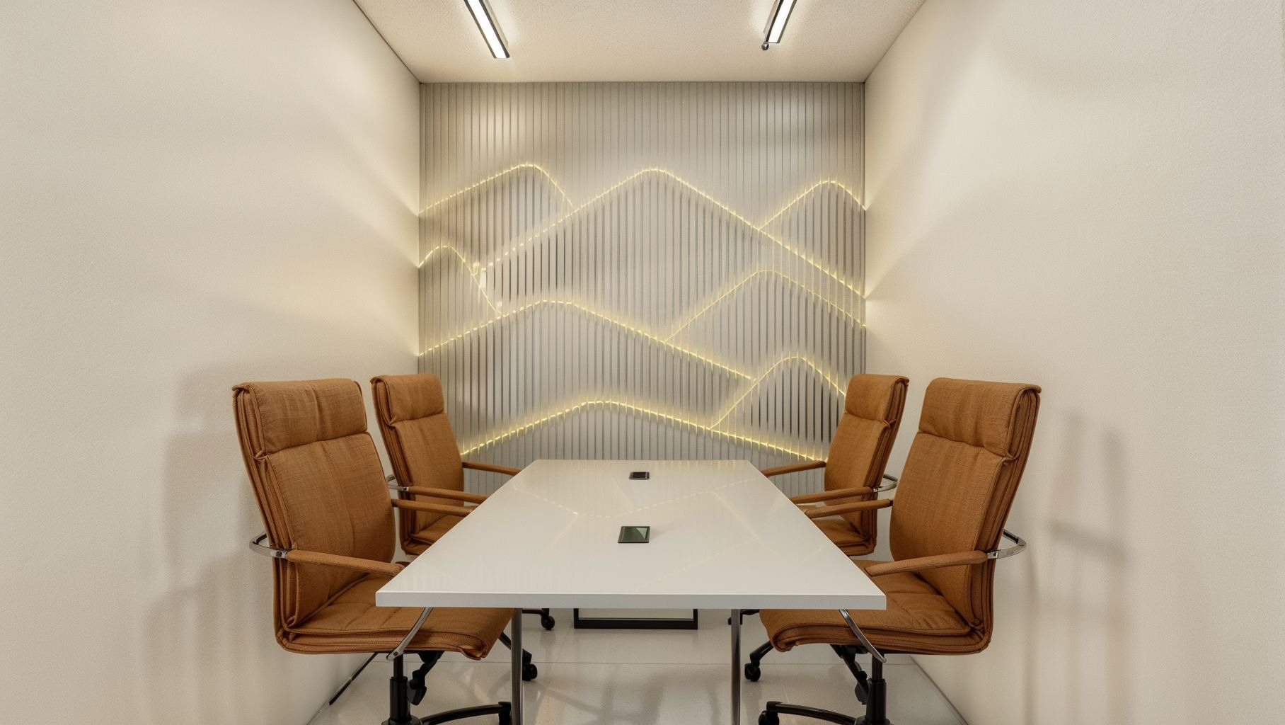A sala de reunião foi projetada para ser versátil, funcional e harmoniosa, combinando design contemporâneo e sofisticação. Cada escolha de materiais, cores e iluminação foi pensada para transmitir confiança e modernidade, reforçando a imagem profissional da empresa.