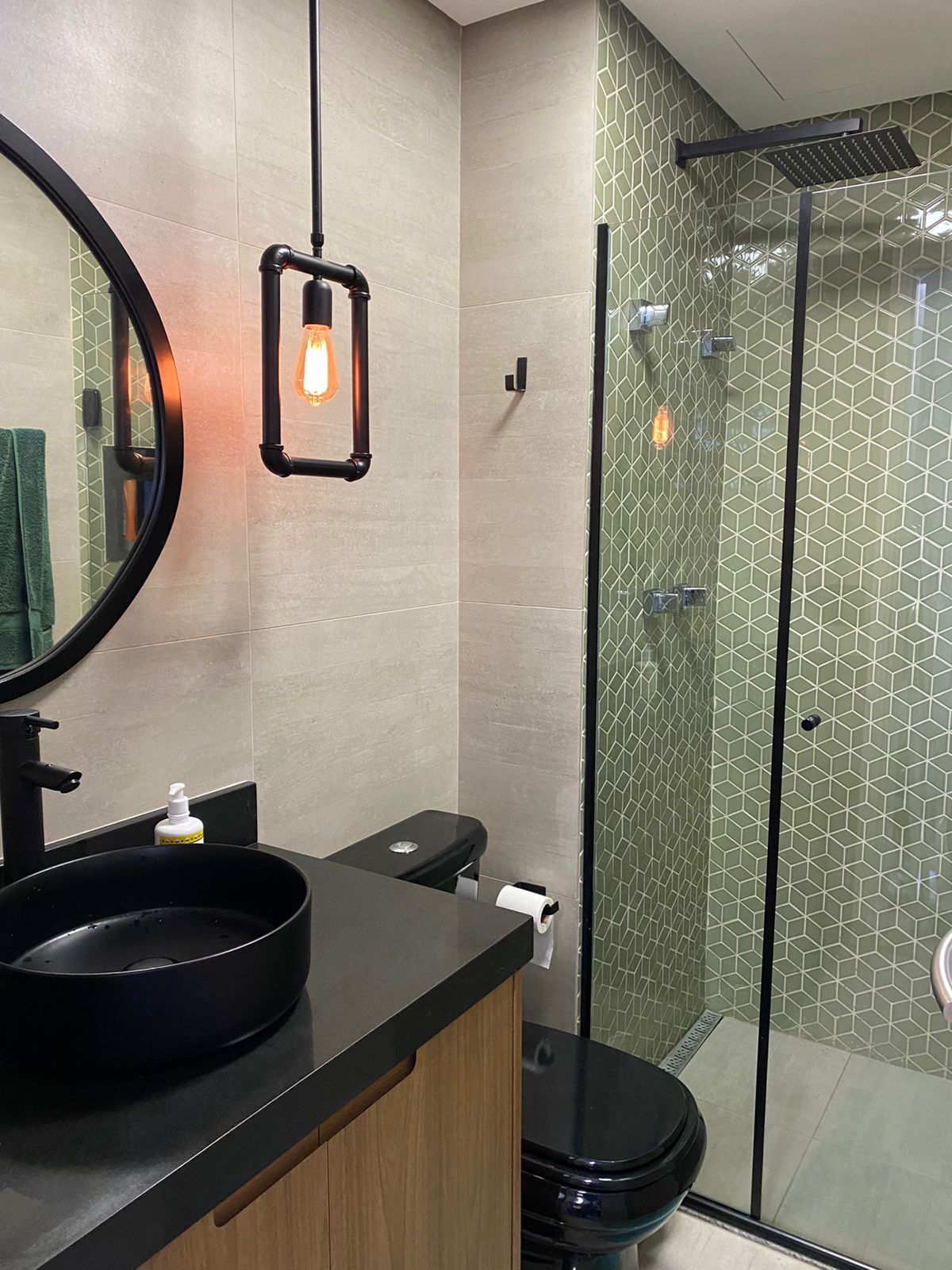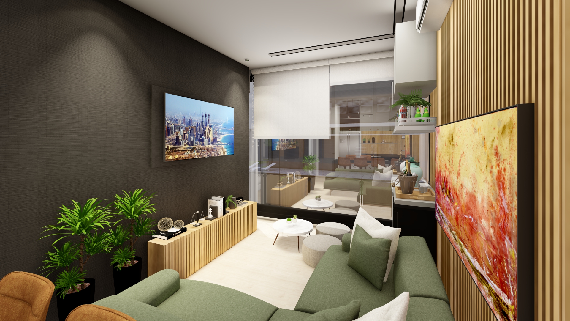 As escolhas de cores e texturas na decoração foram pensadas para refletir uma atmosfera moderna, jovial e masculina. Os tons amadeirados aquecem o ambiente, trazendo aconchego e acolhimento, enquanto o verde, combinado a tons naturais, reforça a sensação de tranquilidade e equilíbrio que todo lar deve oferecer.