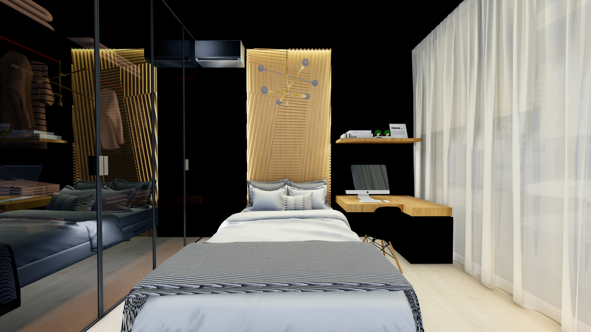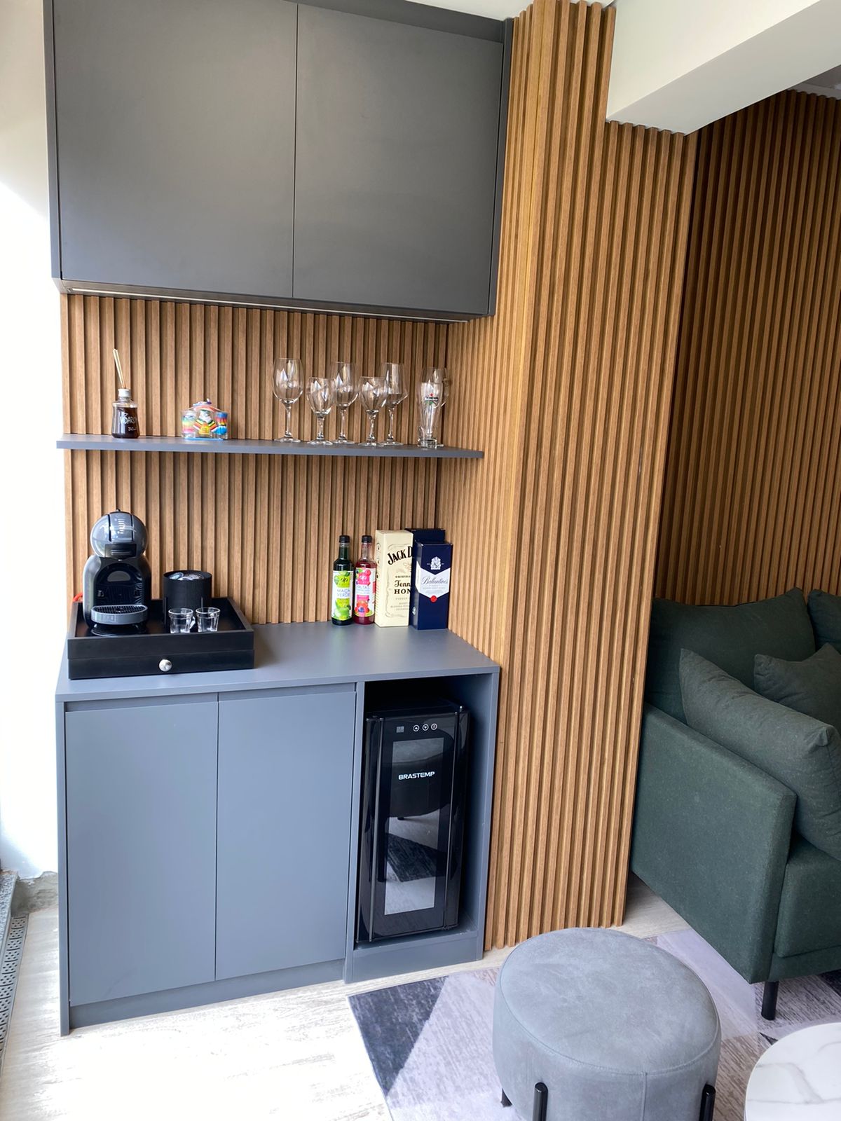Em apenas 40 metros quadrados, criamos uma planta inteligente que valoriza a integração dos ambientes, sem abrir mão da privacidade. O espaço foi planejado de forma funcional, com um quarto individualizado e um home office integrado, proporcionando um ambiente reservado para descanso e produtividade. A separação entre as áreas íntima e social garante mais conforto para o dia a dia e também mais organização para momentos de lazer com convidados.
