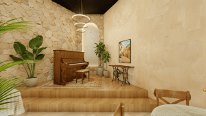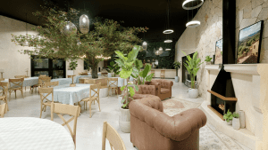 O bar em estilo italiano é um convite ao relaxamento. Inspirado nas paisagens e no estilo de vida da Toscana, combina papel de parede com folhagens, revestimentos em pedras naturais e um banco sob uma árvore central, remetendo ao charme das praças italianas. A lareira, com tapetes persas e sofás de couro estilo hipster, cria um clima intimista e acolhedor, perfeito para happy hours e encontros no fim da tarde. Um palco com piano e área para música ao vivo completam a experiência, transportando os visitantes para um verdadeiro happy hour europeu.